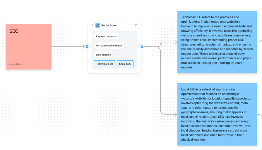 To finish, I employed Jambot to learn about areas outside my expertise. As a designer, I have limited knowledge about SEO, so I don’t know how to promote my work once it’s coded. I created a note on SEO and utilized the Rabbit hole to delve into understanding how to promote my app. This process introduced me to concepts like local and Technical SEO, filling gaps in my knowledge. While I may not become an expert, this newfound knowledge will facilitate communication with SEO specialists and allow me to acquire additional skills: