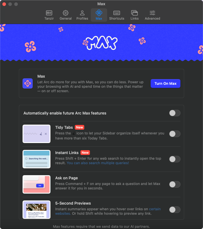 The other major appeal of Arc is that its parent company keeps experimenting and pushing out innovative updates, one of which has been Arc search. The Arc search feature generates AI powered answers with citation for searches in natural language. This is inspired by Perplexity.ai, which has been catering to a niche and loyal userbase, much like Arc browser. This is the Max tab within Arc browser settings, where you can activate its more experimental features: