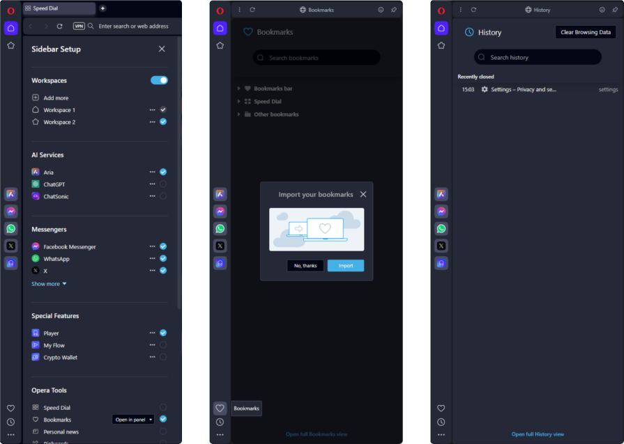 Much like Arc, a lot of what Opera offers is also on the left sidebar. Instead of being completely collapsed (which is an option) — they opted for the default option to be a row of icons always visible. From the top left, the first set of icons is for Workspaces, or basically a collection of open tabs. In the middle is an option to Pin certain services such as messaging and AI tools. In the very bottom, we have the option to access Bookmarks and History. The information architecture is quite clear, and fits existing mental models with some room for creativity.
