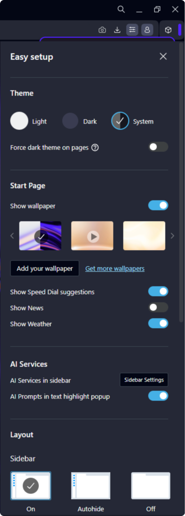 Opera approached this differently — they know that no one likes preinstalled content (read: bloatware) on their devices, but they still have to do it for monetary partnerships. So, they included quick toggles in a sidebar, where the information architecture is neatly organized into easily digestible groupings. With the toggles, a user can quickly change the theme, wallpaper, layout, and choose to turn on or off news, suggestions, and AI services: