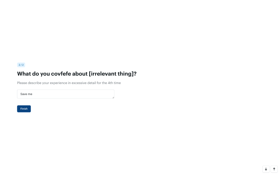 The most frustrating thing about surveys in my opinion is when they (seemingly) ask the same question over and over, leaving respondents confused as to how the different questions are actually different (making them think!). You’ll see this a lot in surveys that are heavy on the rating scale questions because they’re often mistaken for being weightless, but this isn’t true — they still contribute to cognitive overload, especially if there are a lot of them. Here’s a made up but very plausible, almost paraphrased, survey: