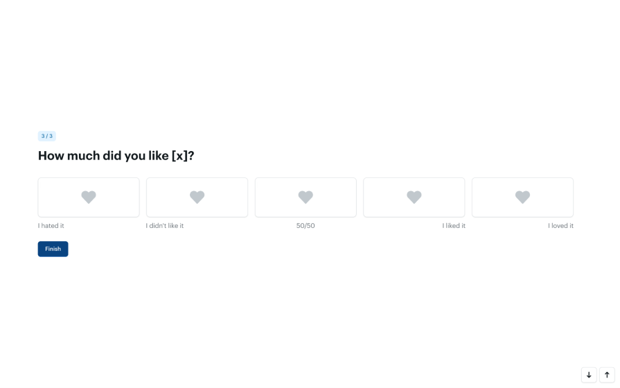 Avoid rating scale questions with an excessive number of options to choose from. Instead, provide the smallest number of choices possible to reduce analysis paralysis, a type of cognitive overload where having too many choices forces people to think more than they want or need to. As a rule of thumb, if you can’t think of a suitable label for a choice (e.g., 1 heart = “I hate it”), then you probably don’t need it: