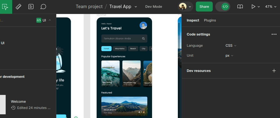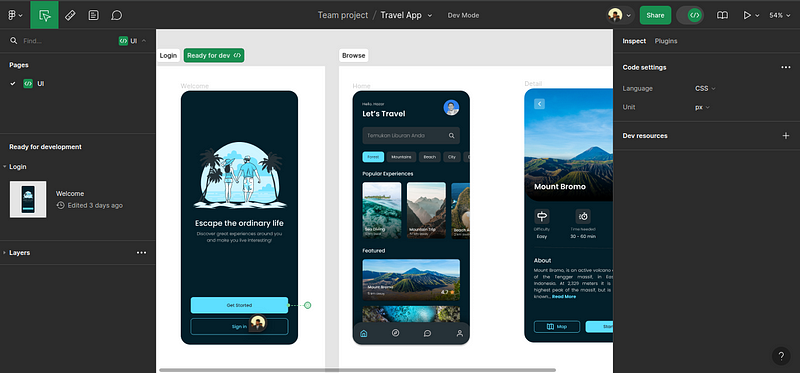 Now, Figma Dev Mode is a platform mode that adds developer-focused features to smoothen the design handoff process. Designers can mark specific design sections or screens as read-for-development and share a Dev Mode-enabled Figma design with developers. Once developers enter Figma Dev Mode, they can identify screens that are ready to build, inspect design elements, compare versions, generate code snippets, and view annotations: