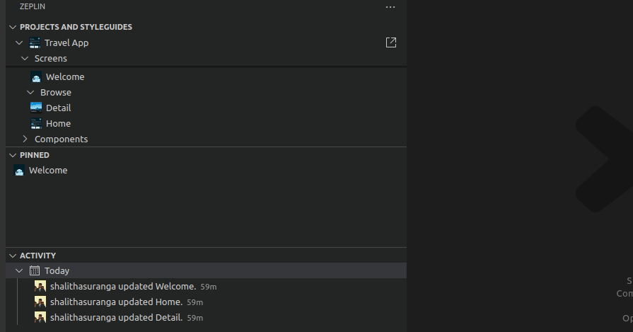 Zeplin offers a minimal VS Code extension that lets developers browse prototype screens productivity. It offers a productive instant search feature, activity log, and Jira integration to navigate to prototype screens. It doesn’t offer inbuilt autocompletion or design preview within VS Code but lets you open the Zeplin desktop app or web app instantly for such needs: